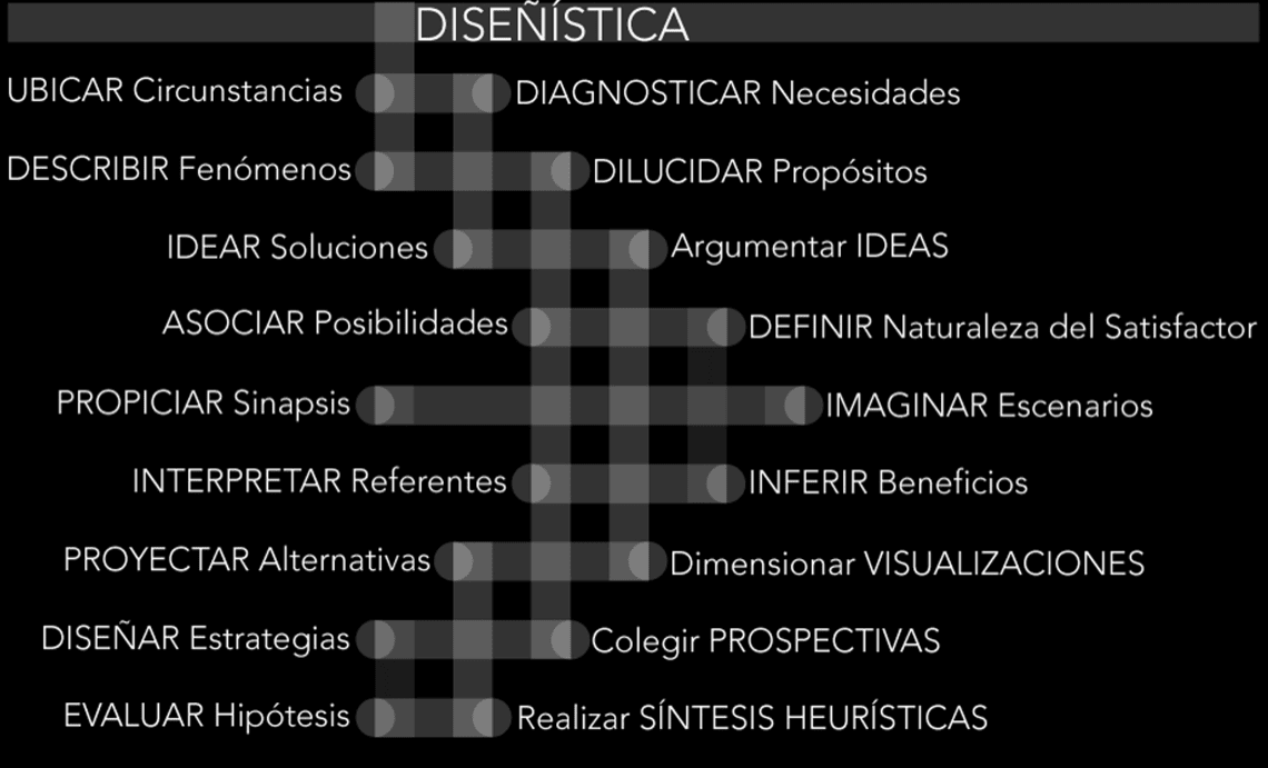 La Diseñística es la interfaz que estructura ideas para su eficaz desarrollo, que planifica estrategias y dinámicas de gnoseopraxis, que visualiza ámbitos conceptuales generativos en los cuales se estructuran sistémicas cualificantes que son expresadas y comunicadas a través de mapas, de algoritmos, de esquemas, de diagramas, de dioramas, de coordenadas, de directrices, de organigramas, de flujogramas, de vectores y modelos de estrategias para guiar, para orientar, para construir las condiciones de posibilidad para que las imaginadas utopías se cumplan.